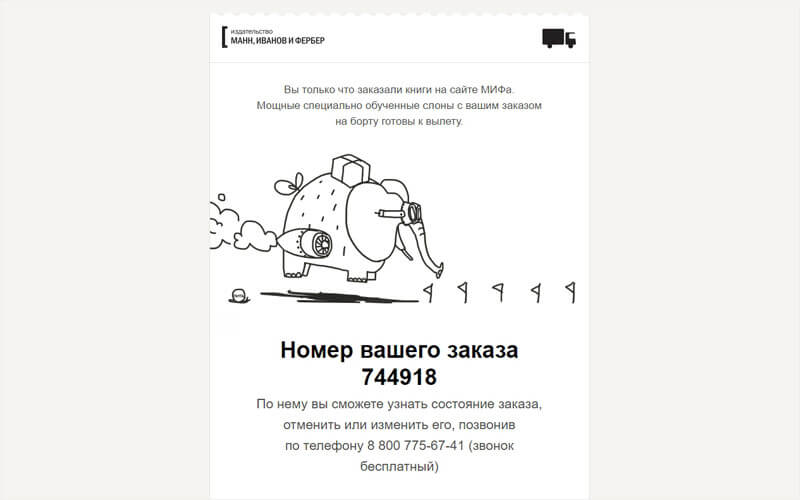 The publishing house "Mann, Ivanov and Ferber" sends letters with flying elephants, makes it possible to find out about the status of the order, and on the day of the order calls and writes SMS. They also have a strong community, great books and thoughtful marketing, of which the elephants themselves are a part.