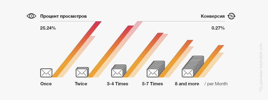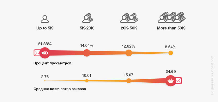 The number of views (Open Rate) and the average number of sales depend on the scale of the online store. The larger it is, the higher the percentage of purchases made from mailings.