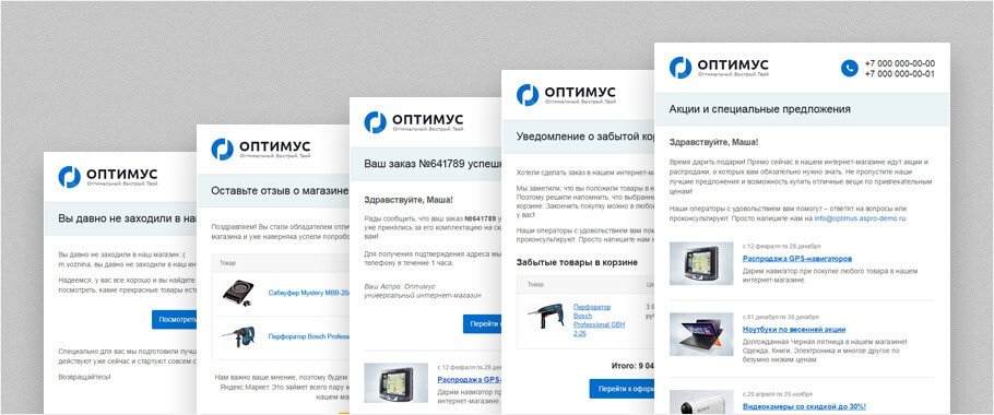 Let's take a look at how trigger emails might look like using Aspro: Market and Aspro: Optimus templates. Using their example, we will analyze popular chains and find out what increase in sales and conversion they can give.