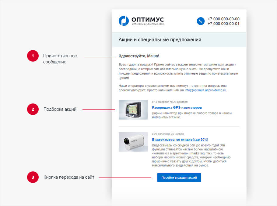 Correctly composed email conversations increase conversions by up to 30%. Thanks to the functionality of 1C-Bitrix, they can be launched in a couple of clicks, and new letter templates from Aspro will allow you not to think about design and layout.